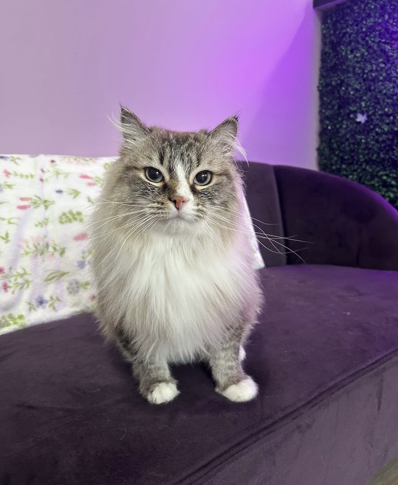 A feline spa haircut experience with calming diffuser oils, cat calming sounds, and slow, rhythmic grooming for maximum comfort.